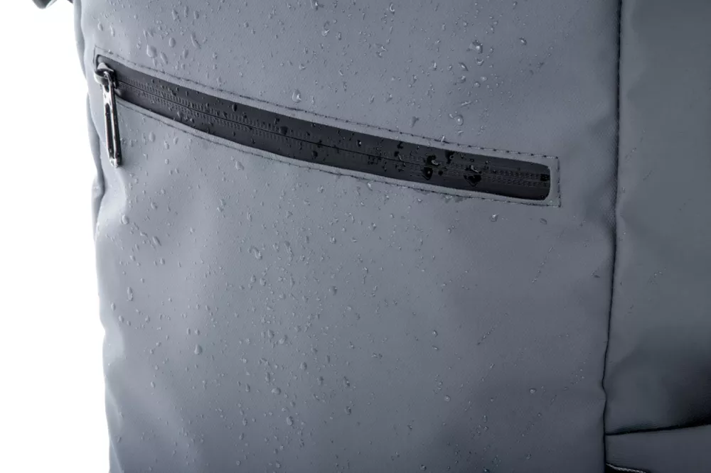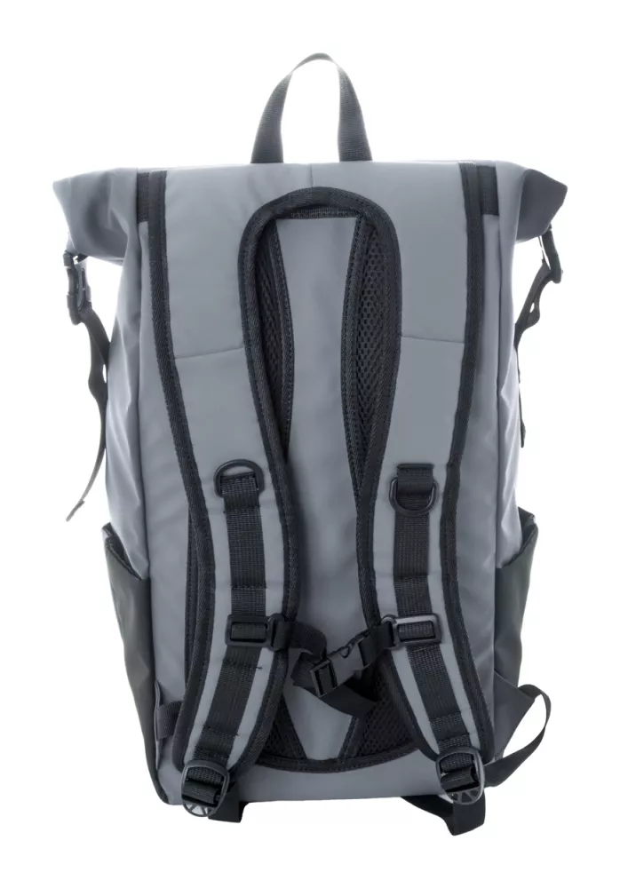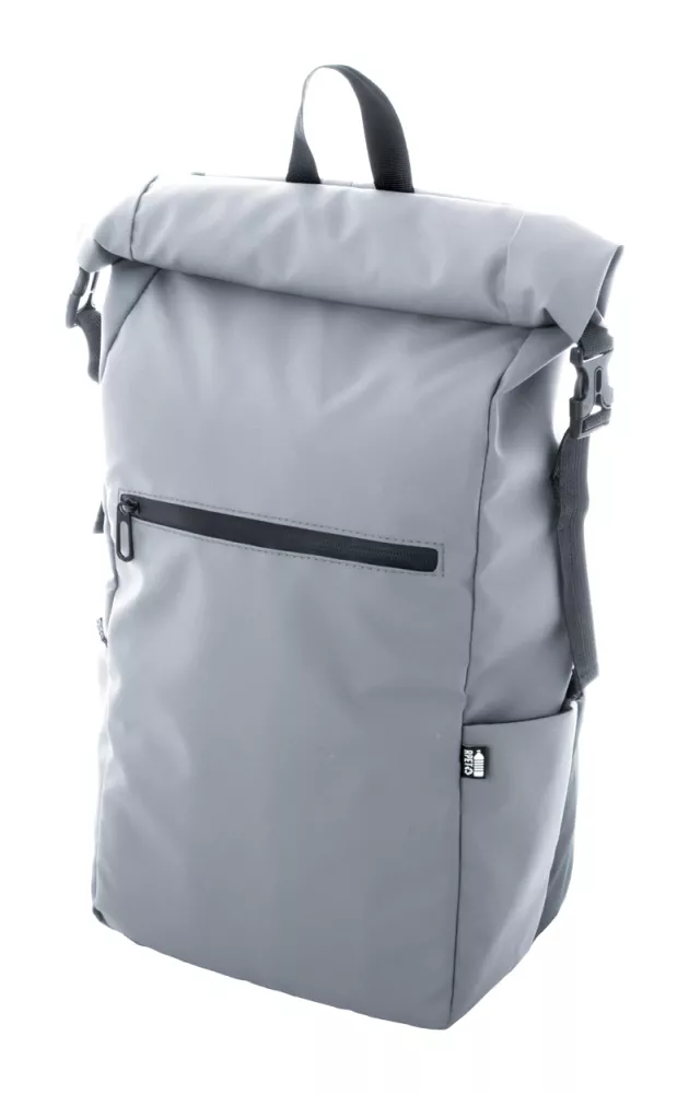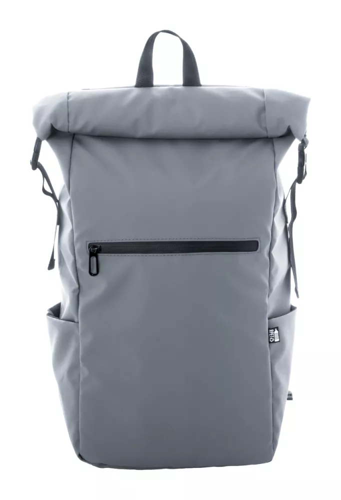 Wodoodporny plecak zwijany z RPET z klamrą i zapięciem na rzep, wyściełaną przegrodą na laptop (16") i tablet (10"). Przednia kieszeń zapinana na zamek. Posiada kieszenie boczne, wyściełane plecy i paski na ramiona. Poliester 600D RPET powlekany PU, z charakterystyczną metką RPET.