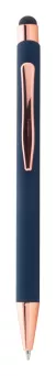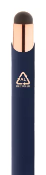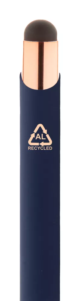Długopis z aluminium pochodzącego z recyklingu i końcówką do ekranów dotykowych z gumowanym wykończeniem i elementami w kolorze różowego złota. Ze specjalną powłoką pod grawer lustrzany w kolorze różowego złota. Niebieski wkład.
