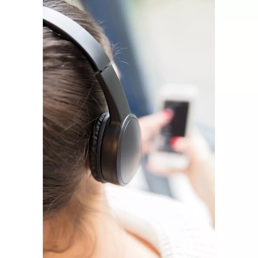 Słuchawki bezprzewodowe BT 4.1, nauszne, wykonane z ABS, poduszki z PU, regulowany rozmiar opaski na głowę, w pełni naładowany akumulator o pojemności 200 mAh umożliwia słuchanie muzyki do 4 godzin, zasięg do 10 m, kabel micro USB do ładowania w komplecie