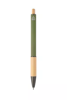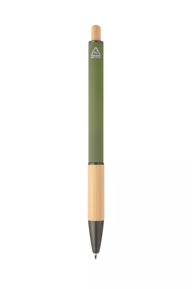 Długopis z aluminium pochodzącego z recyklingu z uchwytem i przyciskiem z bambusa, gumowanym korpusem i elementami z brązu. Z niebieskim wkładem.