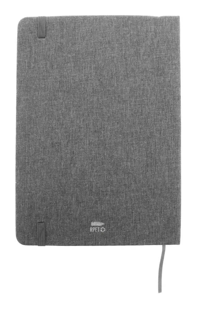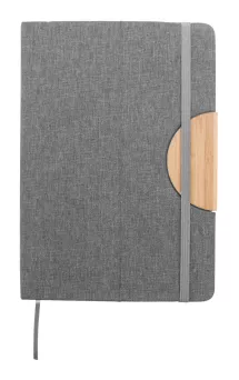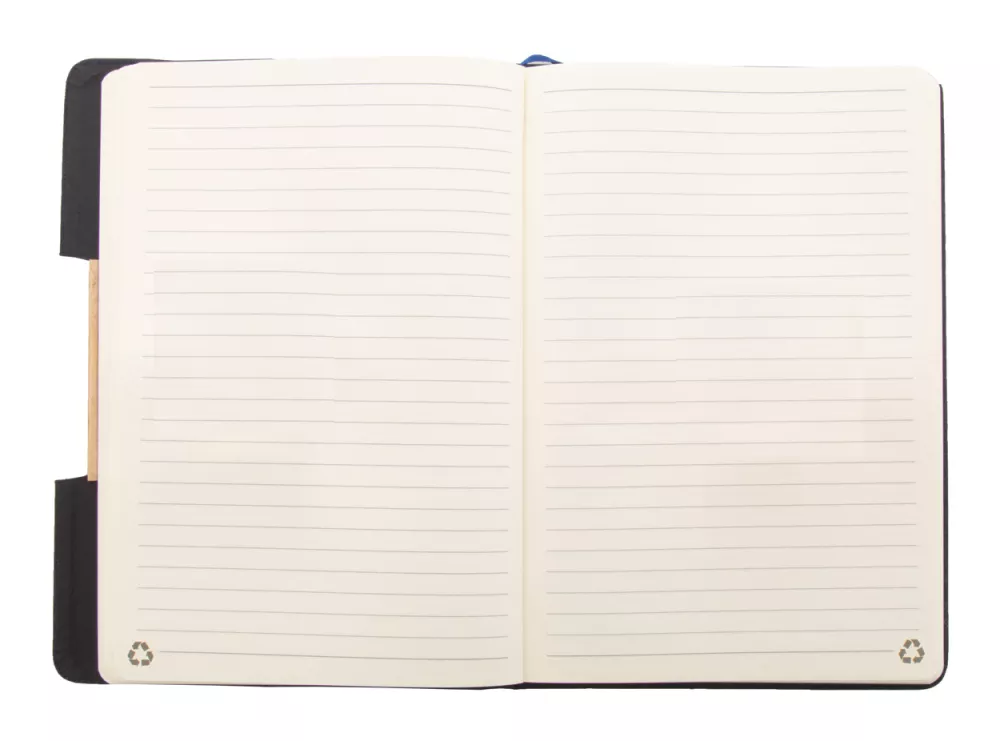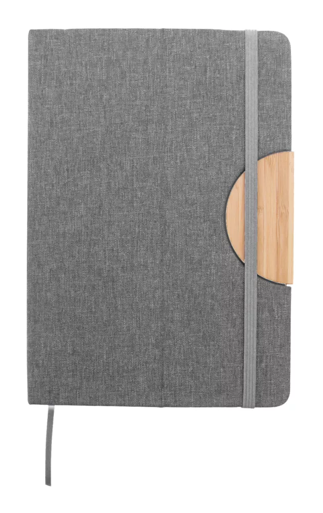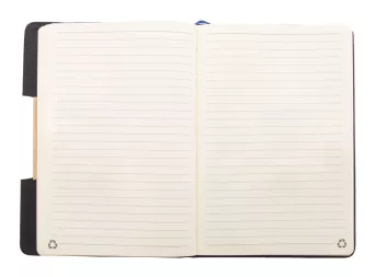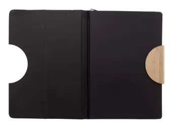 Notes pokryty poliestrem RPET z bambusową wkładką i podstawą na telefon. Z 80 kartkami w linie z papieru recykling, zakładką i gumowym paskiem. Rozmiar A5.