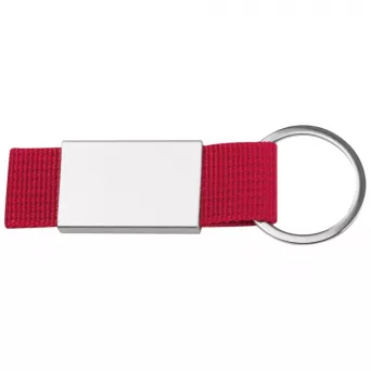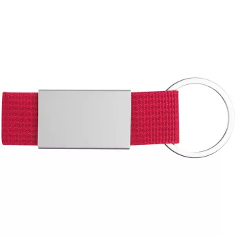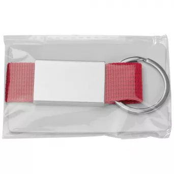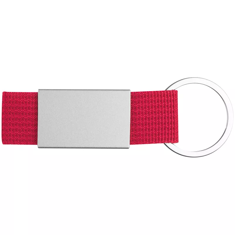 Brelok składający się z kolorowej wytrzymałej taśmy i metalowej (aluminium) tabliczki,na której można umieścić logotyp firmy.
