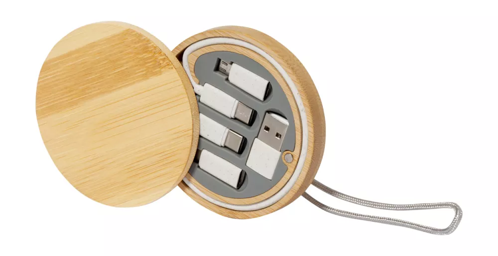 Zestaw kabli USB do ładowania z plastiku ze słomy pszenicznej w bambusowym etui z paskiem do noszenia. Ze złączami micro USB, USB-C i Lightning. Z wejściami USB i USB-C.