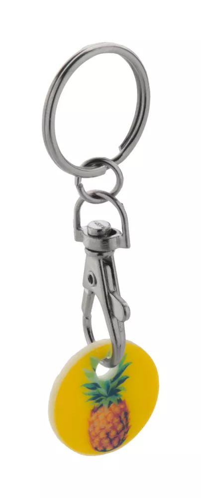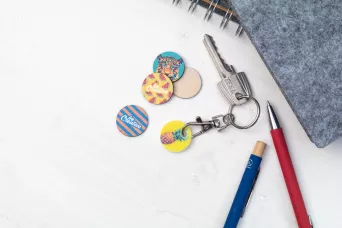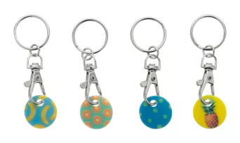 Metalowy brelok z karabińczykiem z plastikowym żetonem do wózka na zakupy z nadrukiem w full kolorze. Cena obejmuje nadruk UV LED jednostronny. Rozmiar monety: ø23×2 mm. Min. ilość: 200 szt.