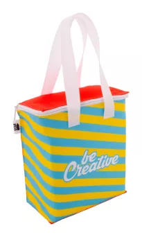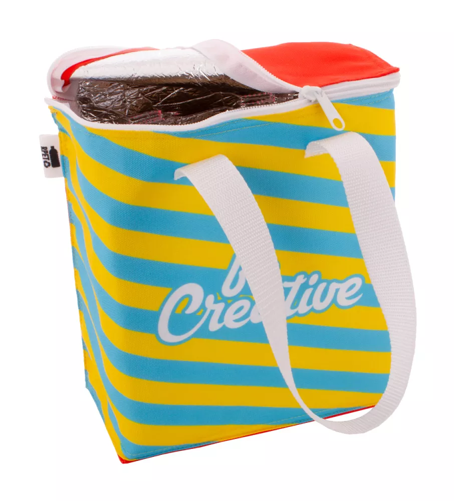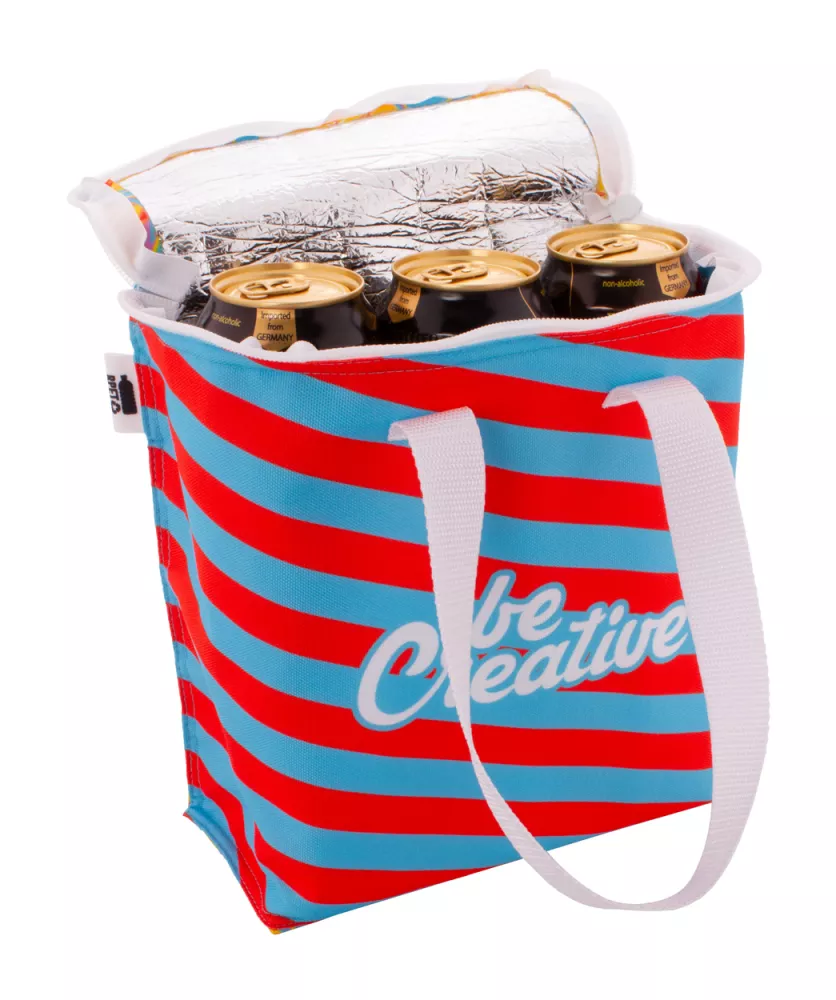 Personalizowana, zapinana na zamek torba termoizolacyjna z poliestru 600D RPET z aluminiowym wypełnieniem na 6 puszek 0,33 L. Z nadrukowaną na całej powierzchni grafiką sublimacyjną i charakterystyczną metką RPET. Min. ilość: 25 szt.