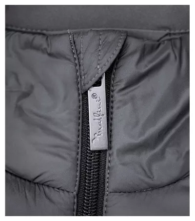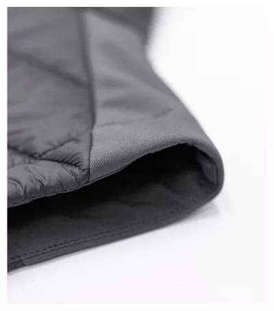 połączenie tkaniny pikowanej i softshellowej, krój taliowany za pomocą bocznych części, zamek błyskawiczny na całej długości z ochroną podbródka, boczne kieszenie z zamkiem błyskawicznym, wewnętrzna kieszonka na suwak, lekko przedłużona w tylnej części, dostęp do brandingu w części tylnej