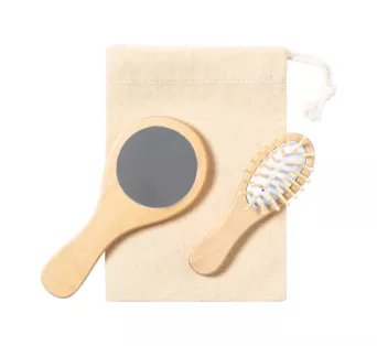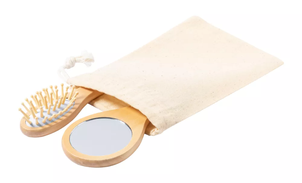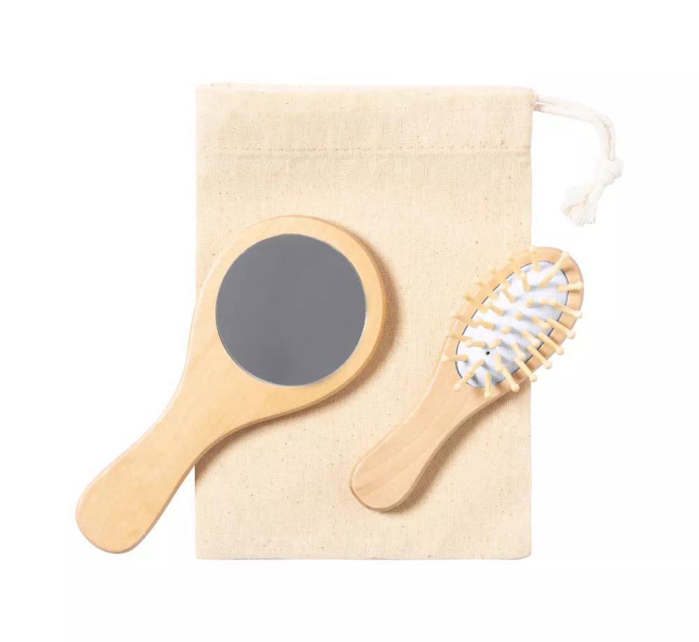 Drewniana szczotka do włosów i lusterko kosmetyczne w bawełnianym etui ze sznurkiem.