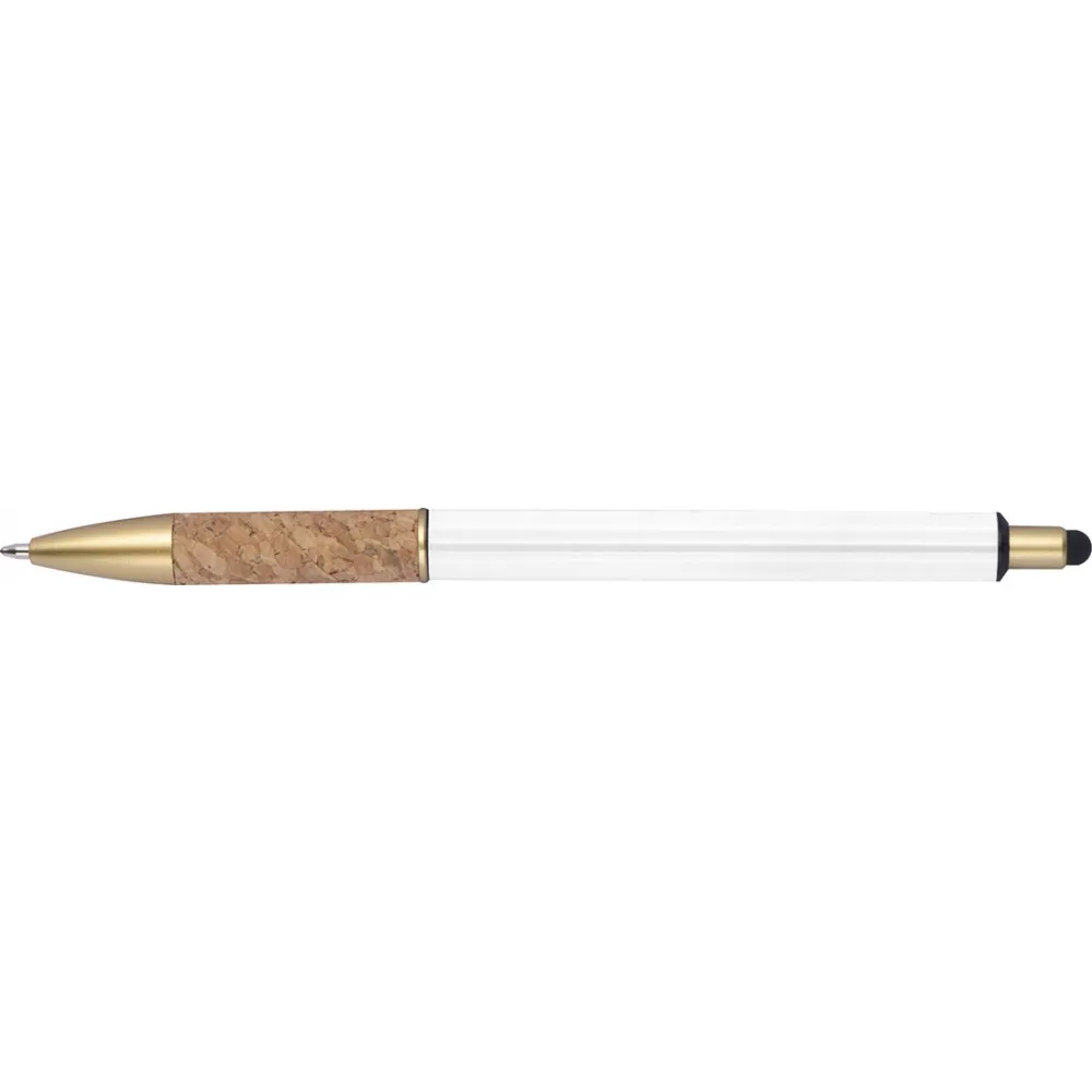 Metalowy długopis ze złotymi elementami i korkową strefą uchwytu. Długopis pisze na niebiesko.