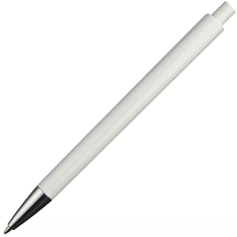 Plastikowy długopis z wkładem piszącym na niebiesko. Długopis posiada białą obudowę i kolorową aplikację pod klipem.