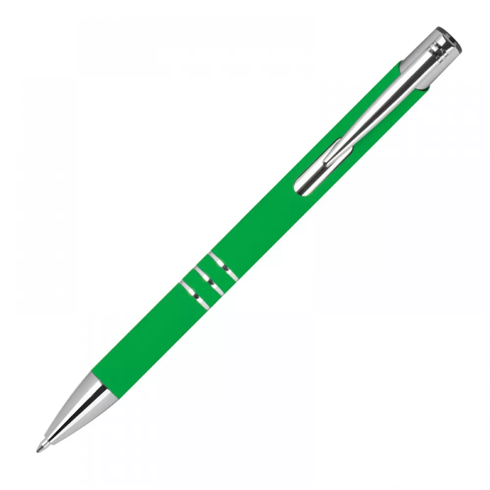 Długopis wykonany z aluminium z recyklingu z przyjemną w dotyku, gumową powierzchnią i żelowym niebieskim wkładem.