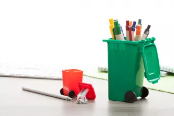 Podstawka na długopisy w kształcie kosza na śmieci.