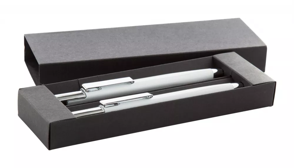 Aluminiowy zestaw długopis i ołówek techniczny w czarnym pudełku prezentowym. Zawiera niebieski wkład i rysiki 0,7 mm.