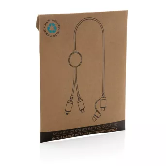Kabel do ładowania i synchronizacji z 4 końcówkami: USB, 2 x USB C, 2 w 1 (micro USB i iOS), końcówki z drewna wiśniowego z certyfikatem FSC®, kable wykonane z TPE i poliestru z certyfikatem RCS, całkowita zawartość materiałów z recyklingu obliczona na podstawie wagi całkowitej przedmiotu: 46%, długość 120 cm, w opakowaniu z papieru kraftowego z certyfikatem FSC®
