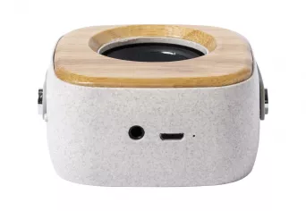 Głośnik bluetooth w obudowie z bambusa i ekologicznego plastiku ze słomy pszenicznej. Z wbudowanym akumulatorem. Zawiera kabel USB.