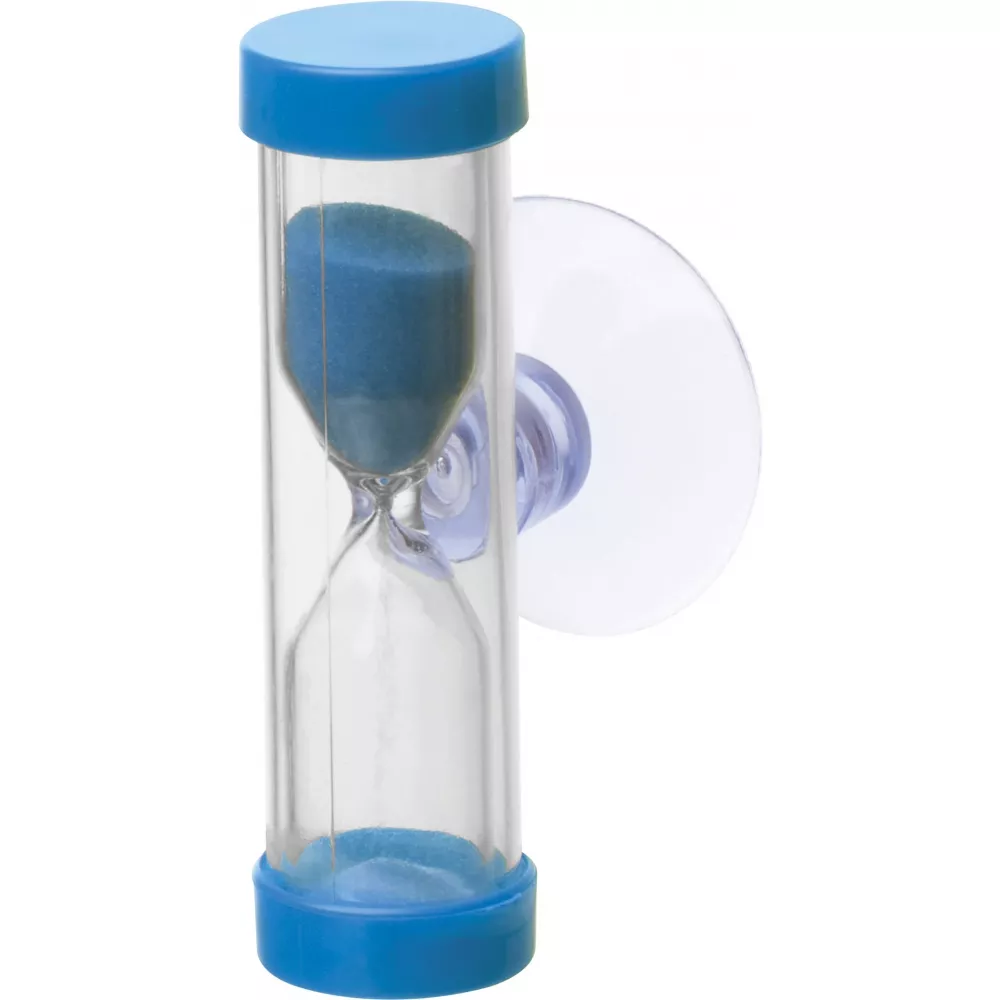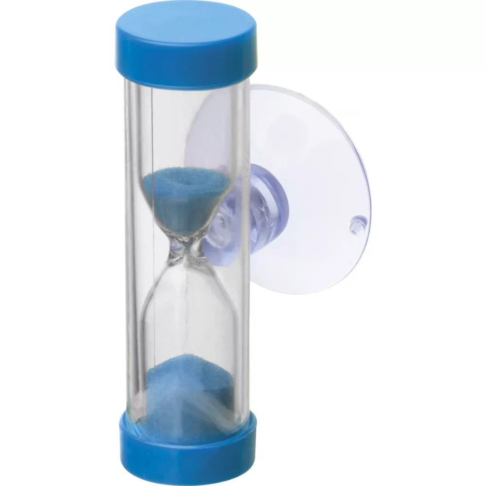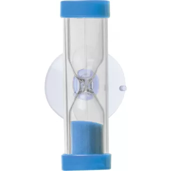 Mała klepsydra wypełniona kolorowym piaskiem, jedno przesypanie się piasku trwa 3 minuty.