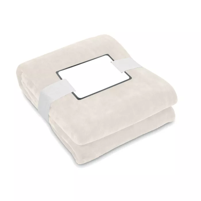 Koc z flaneli RPET 280 gr/m² ze wstążką i etykietą do nadruku.