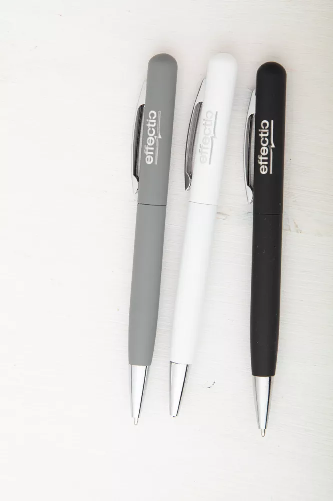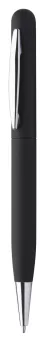 Metalowy długopis z gumowanym korpusem i niebieskim wkładem. Idealny pod grawer lustrzany.