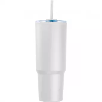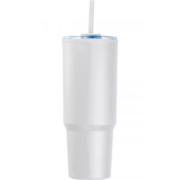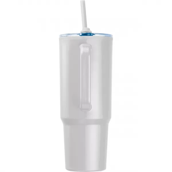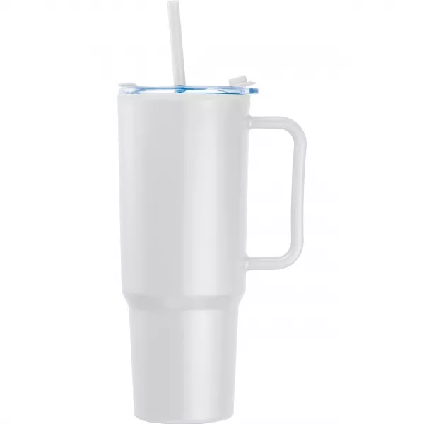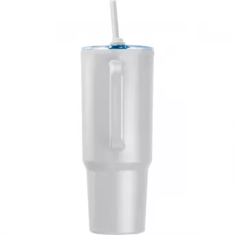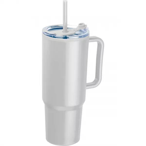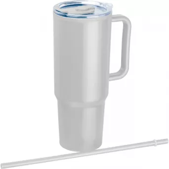 Kubek XXL, o pojemności 1200 ml, z podwójnymi ściankami, uchwytem do przenoszenia i słomką do picia.