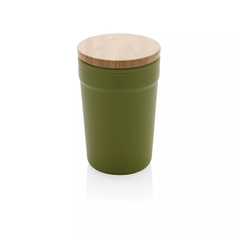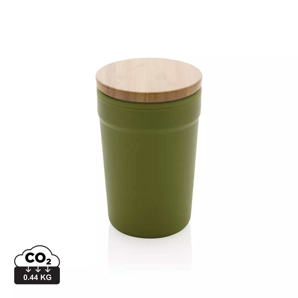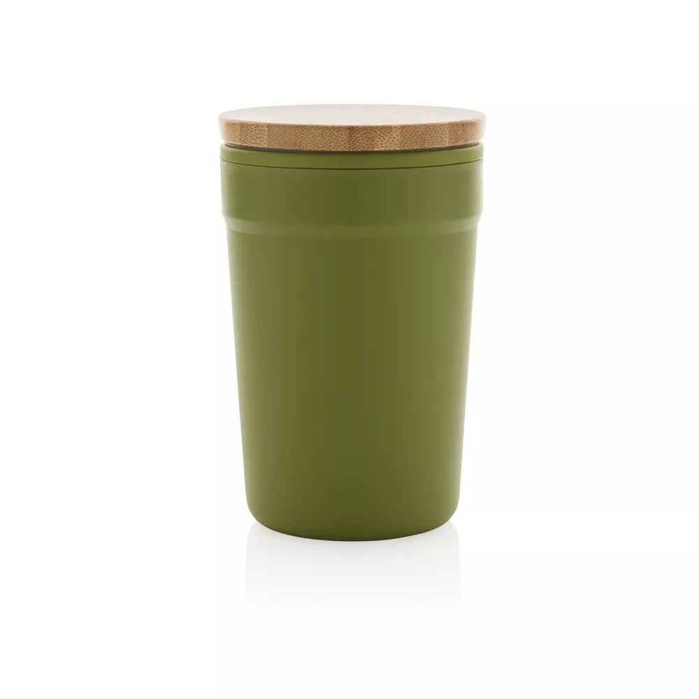 Kubek podróżny 300 ml, bambusowe wieczko, wykonany z PP z recyklingu z certyfikatem GRS, całkowita zawartość materiałów z recyklingu obliczona na podstawie wagi całkowitej przedmiotu: 52%, w ozdobnym pudełku z papieru kraftowego z certyfikatem FSC®
