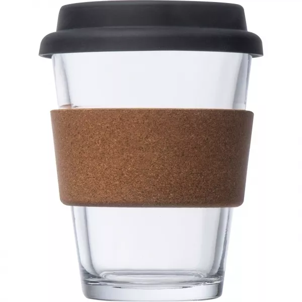 Szklany kubek o pojemności 350 ml, z silikonowym zamknięciem z ustnikiem oraz rękawkiem wykonanym z korka, chroniącym przed oparzeniem.