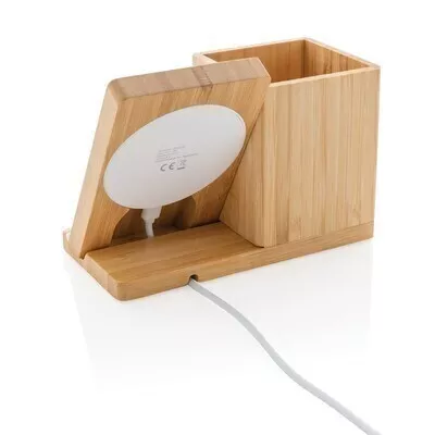 Ładowarka bezprzewodowa 5W, stojak na przybory do pisania, wykonana z naturalnego bambusa, posiada 2 porty USB do ładowania, bezprzewodowe ładowanie jest kompatybilne ze wszystkimi urządzeniami posiadającymi możliwość ładowania indukcyjnego, wyjście USB 5V/1A max, kabel micro USB 150 cm w komplecie, wzór zastrzeżony® Świetny pomysł na gadżet firmowy, wystarczy umieścić na nim logo firmy lub slogan marki i postawić na biurku w salonie firmowym, biurze obsługi klienta czy wręczyć klientom.