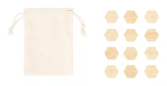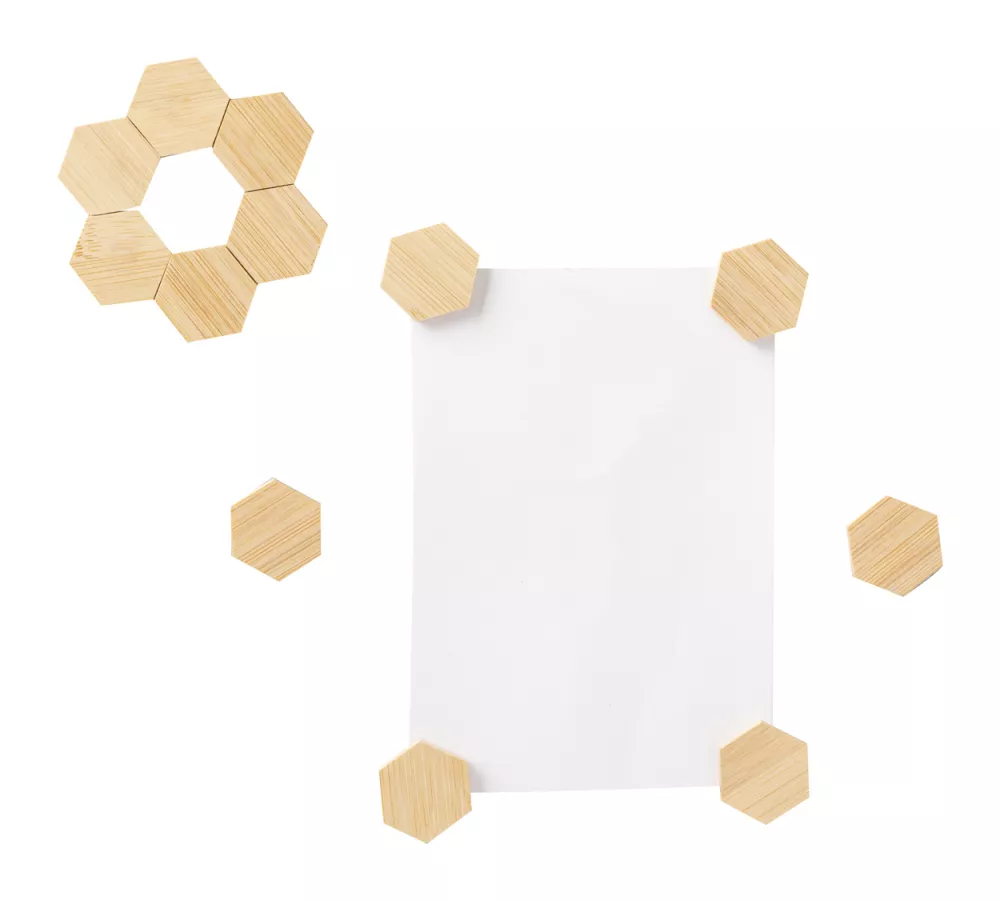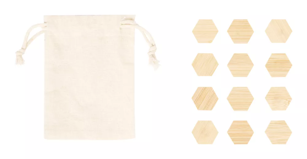 12-częściowy zestaw bambusowych magnesów na lodówkę, w bawełnianym etui ze sznurkiem.