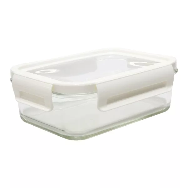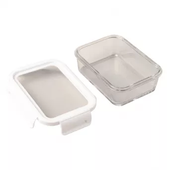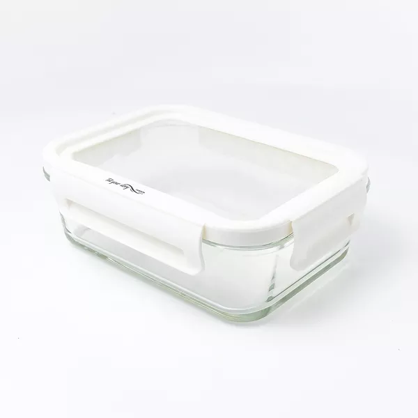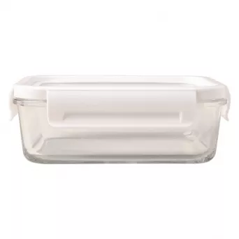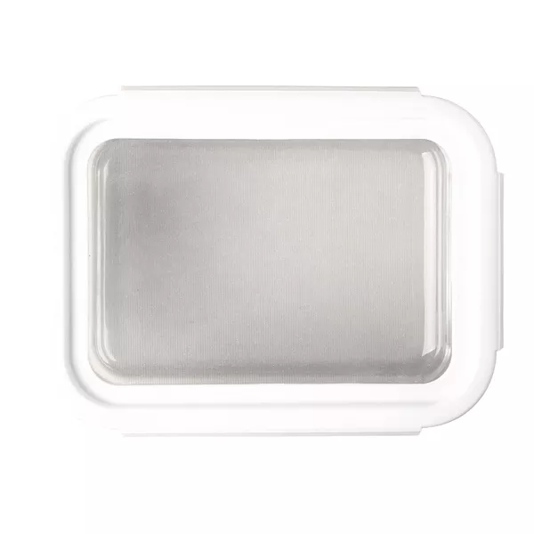 Szklany pojemnik na lunch (900 ml) z hermetyczną pokrywką z silikonu. Elastyczna pokrywka pozwala dopasować się do zawartości pojemnika zwiększając jego objętość. Można używać w mikrofalówce, piekarniku, zamrażarce oraz myć w zmywarce. Zakres temperatur dla szkła: -40 ~400 ℃. Zakres temperatur dla pokrywki: -20 ~120 ℃