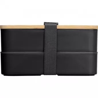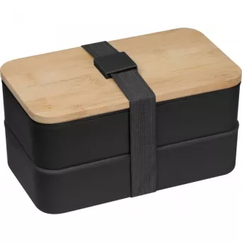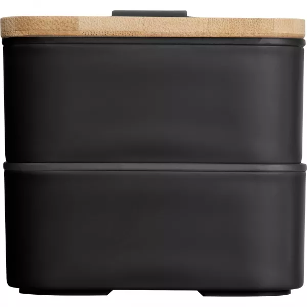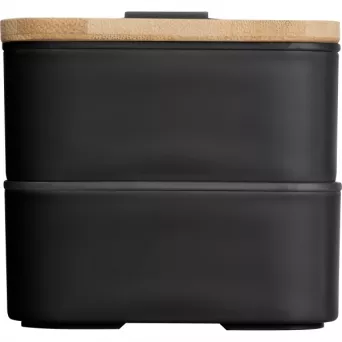 Dwupoziomowe pudełko na lunch z dwiema osobnymi przegrodami (obie z własną przykrywką), bambusową pokrywką i przekładką (do oddzielania poszczególnych części posiłku w obrębie jednej przegrody). Bambusową pokrywkę można wykorzystać jako deseczkę do krojenia lub outdoorowy talerzyk. W zestawie znajdziemy również nóż, widelec oraz szeroką gumkę, zespajającą wszystkie elementy tego pudełka śniadaniowego.