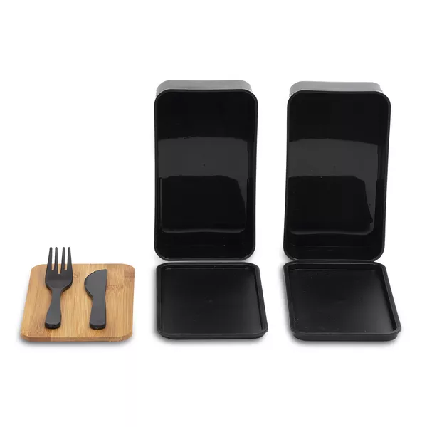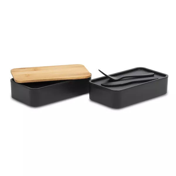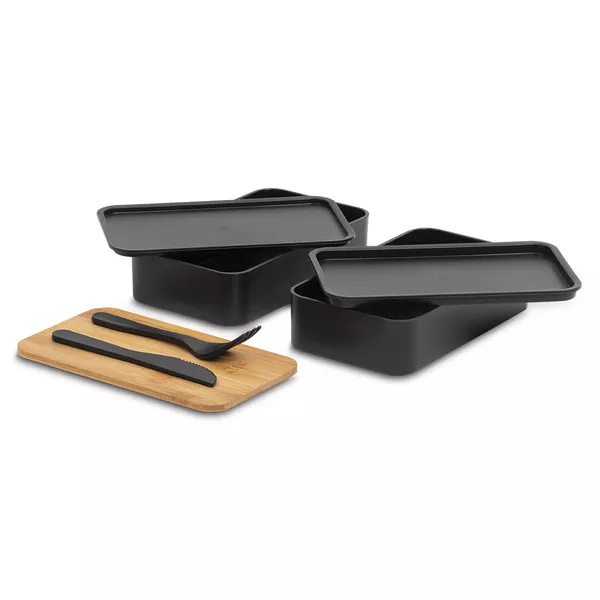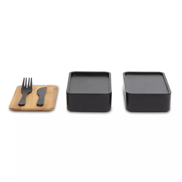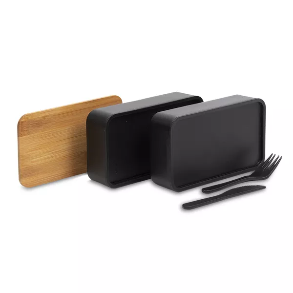 Lunch box zamykany taśmą elastyczną. Posiada dwa pojemniki o pojemności 500 ml każdy. Wyposażony w widelec i nóż oraz bambusową deseczkę do krojenia.