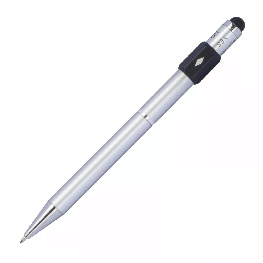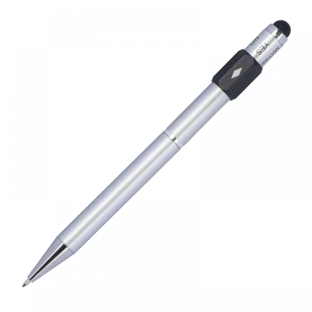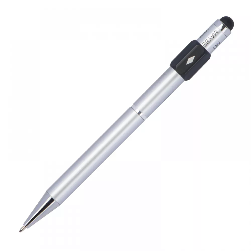 Długopis, który zdecyduje za Ciebie. Zadaj pytanie, zakręć obrotowym elementem i wylosuj odpowiedź. Długopis wykonany z metalu, piszący na niebiesko.