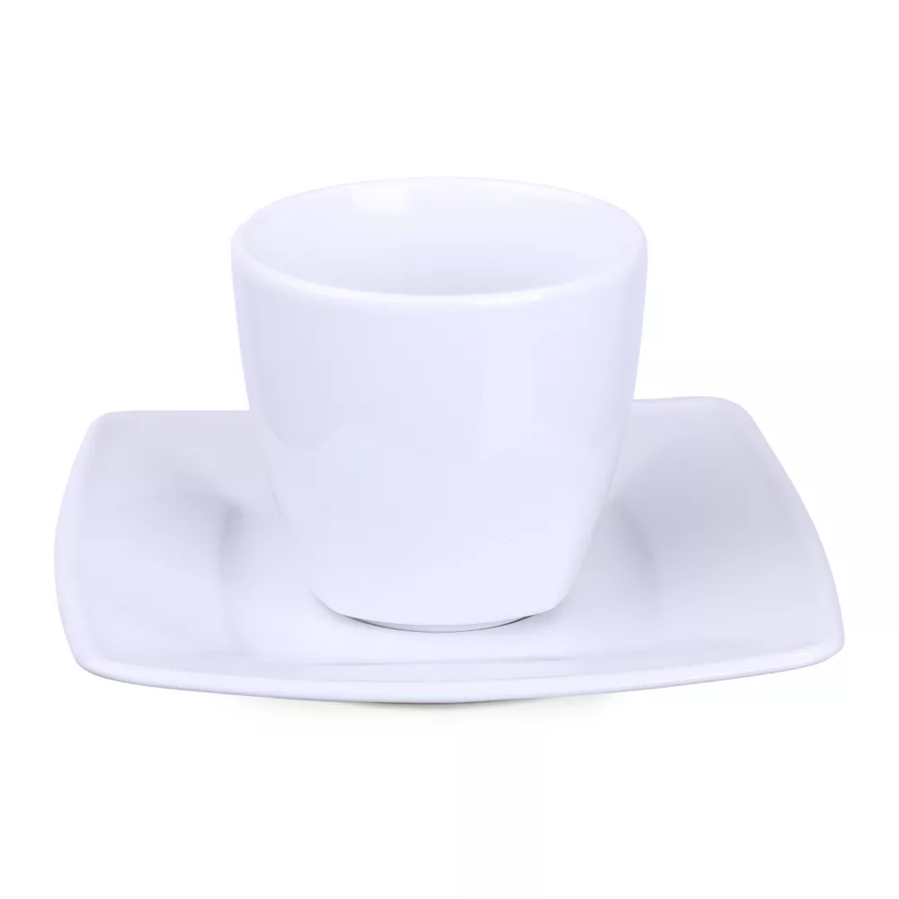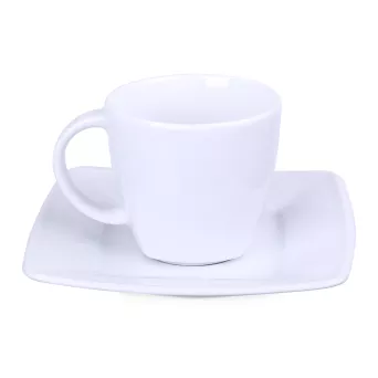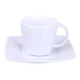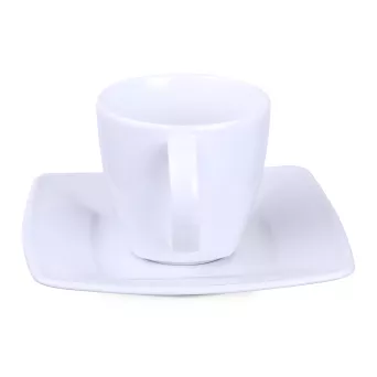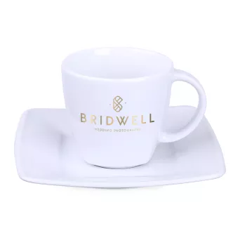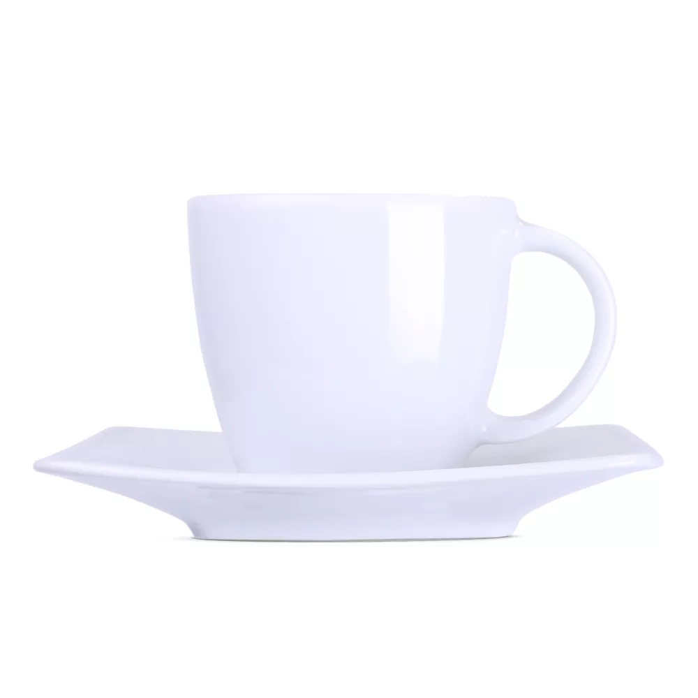 Elegancka porcelanowa filiżanka w zestawieniu z dedykowanym talerzykiem. Tym, co wyróżnia ten zestaw jest delikatne kwadratowe wykończenie widoczne dolnej części filiżanki.