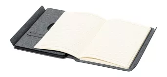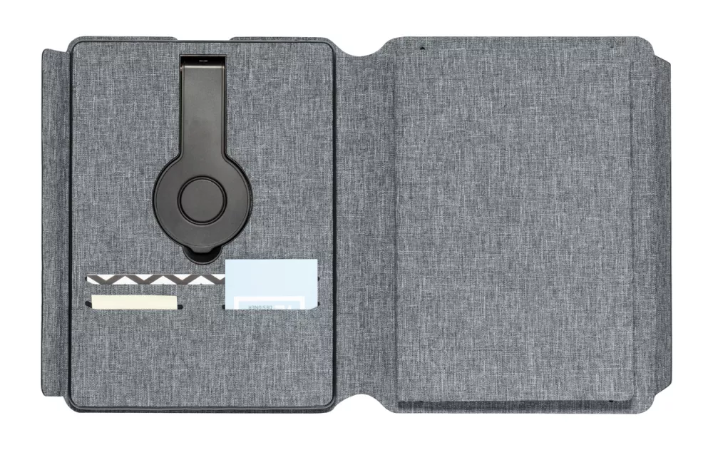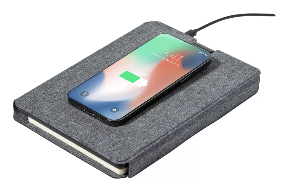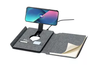 Notes z okładką z poliestru 300D RPET z 65 kartkami w linie. Z powerbankiem 5000 mAh (z portem ładowania USB-C i wejściem USB-C) oraz składaną dwustronną magnetyczną szybką ładowarką indukcyjną (10W). Kompatybilny z Apple Watch® i iPhone® 12 lub nowszym. W zestawie kabel USB.