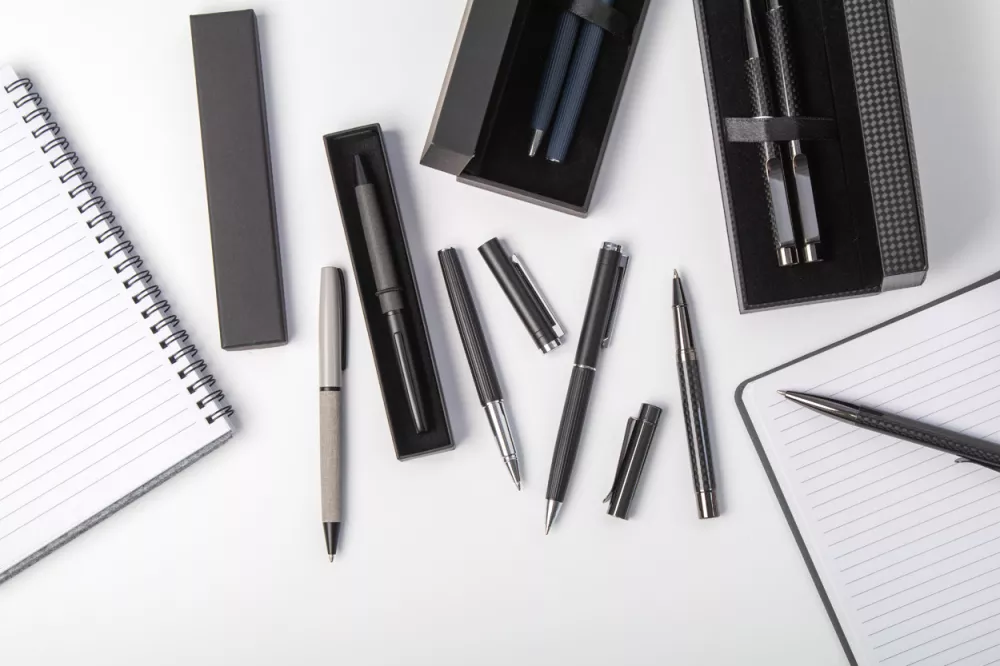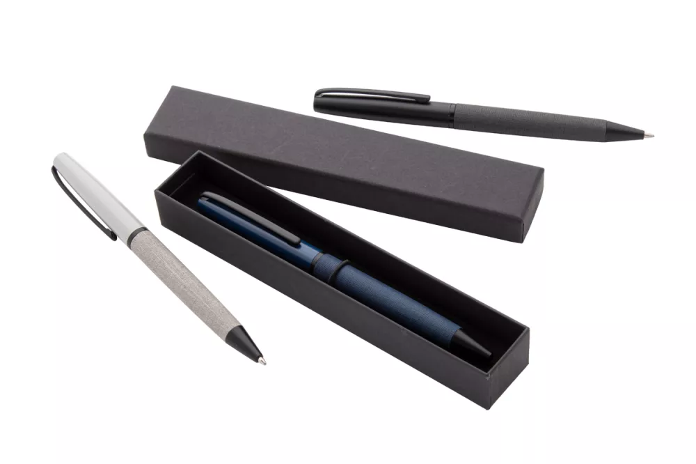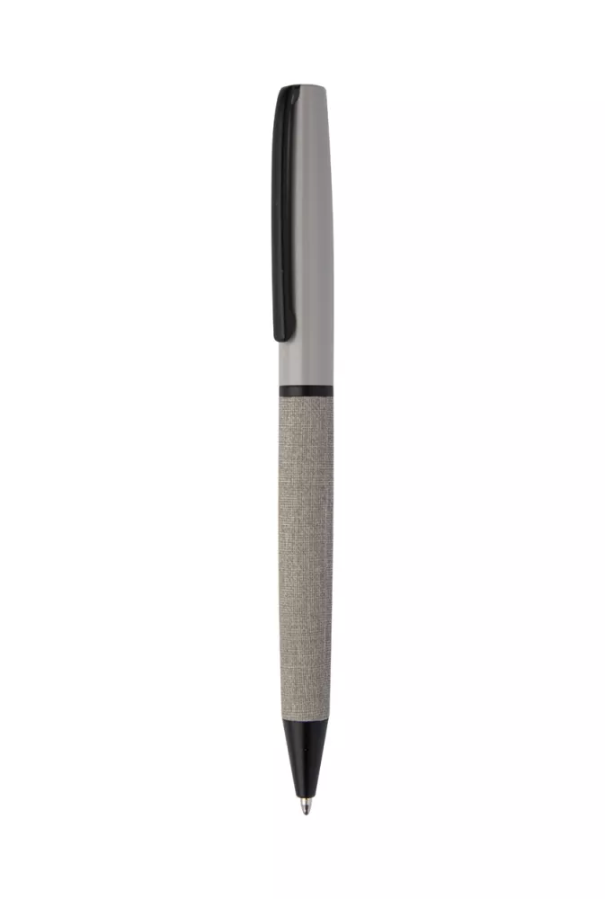Elegancki, metalowy przekręcany długopis z korpusem pokrytym skórą PU i czarnymi elementami. W czarnym pudełku upominkowym. Z niebieskim wkładem.