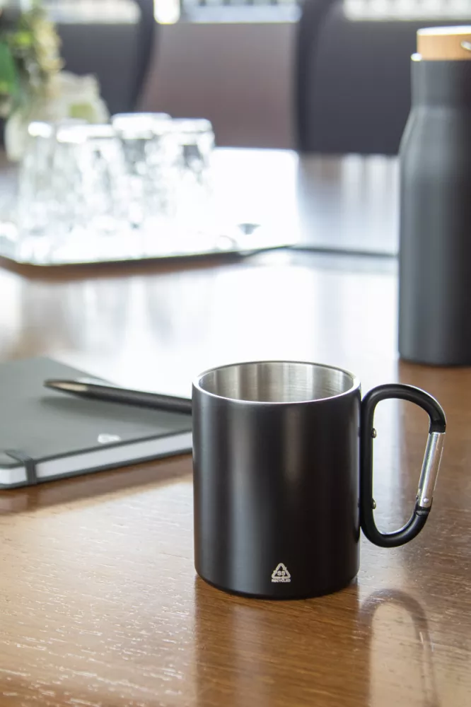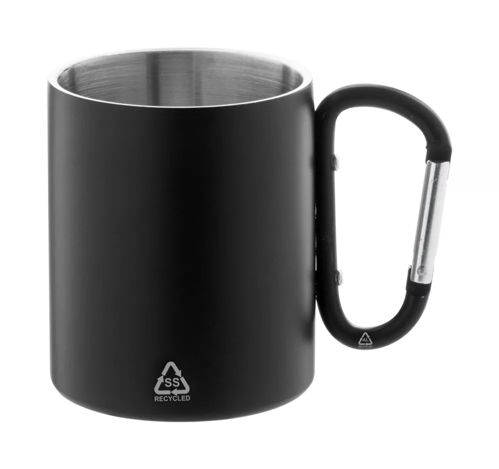 Kubek termiczny z podwójną ścianką ze stali nierdzewnej z recyklingu. Z karabińczykiem z aluminium pochodzącego z recyklingu w dopasowanym kolorze. 300 ml. W kartoniku.