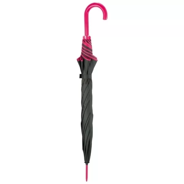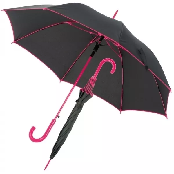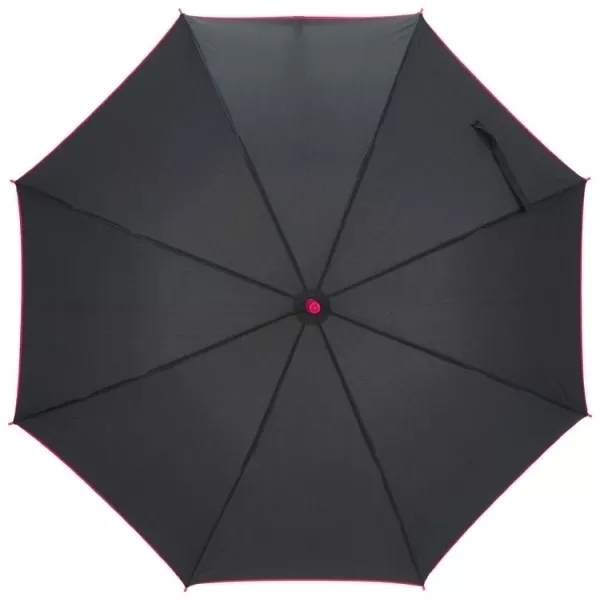 Czarny parasol o wyjątkowym designie. Rączka oraz krawędzie parasola są w tym samym, ale innym niż całość kolorze. Parasol posiada materiałowy pokrowiec. Pojedynczo pakowane w woreczek foliowy.