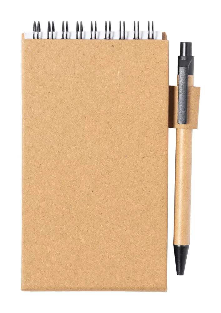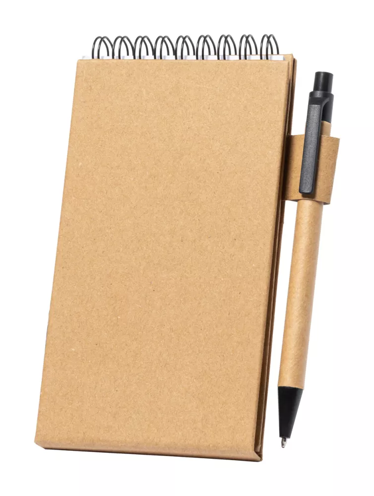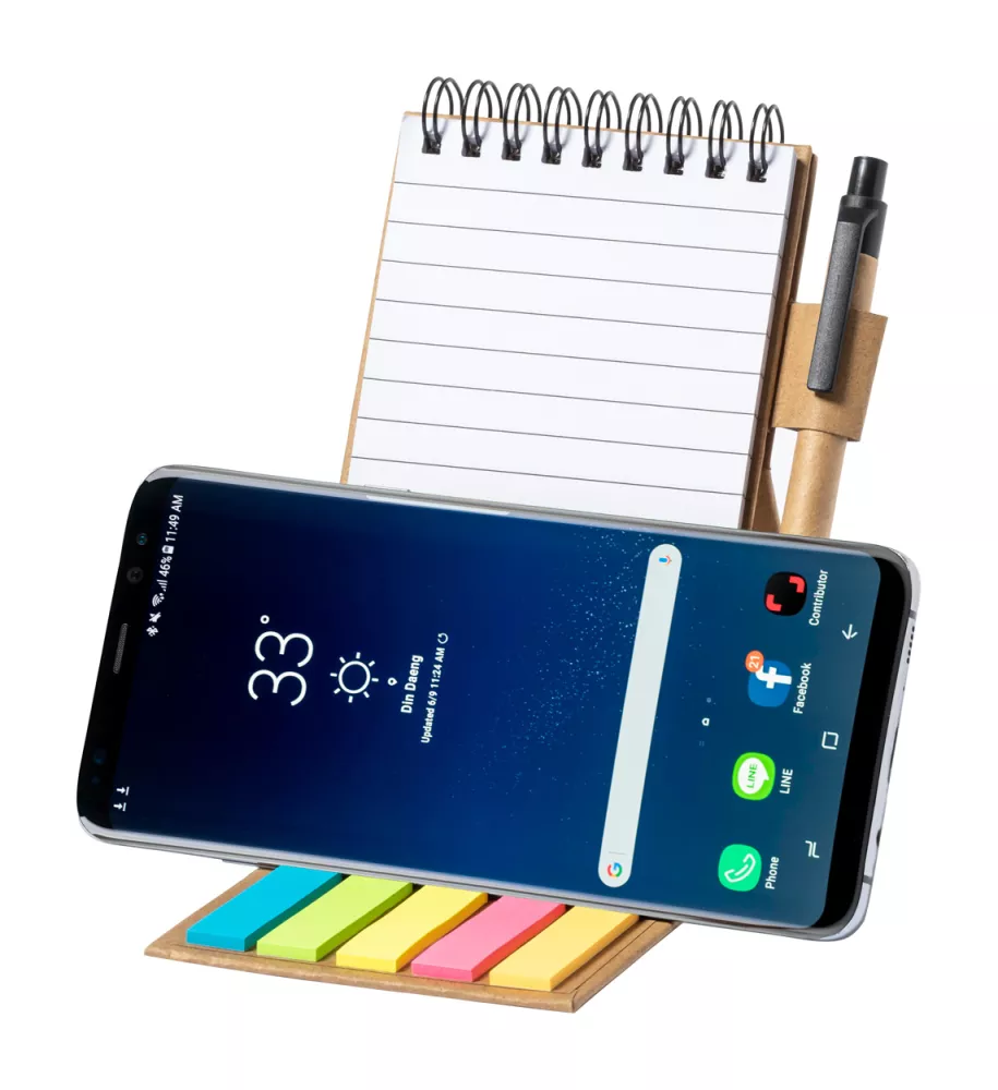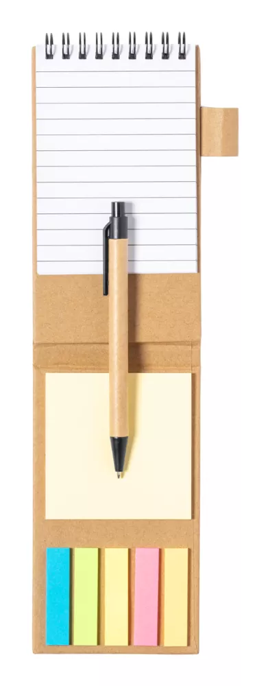 Notatnik na spirali pokryty papierem z recyklingu, 30 kartek w linie, 25 karteczek samoprzylepnych i 125 zakładek (w 5 różnych kolorach). Z funkcją uchwytu na telefon komórkowy. Zawiera długopis z papieru z recyklingu z niebieskim wkładem.
