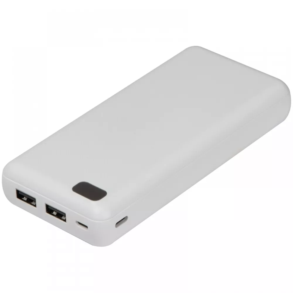 Plastikowy power bank dla firm, o mocy 20 000 mAh z cyfrowym wskaźnikiem ładowania. Dwa porty USB umożliwiają jednoczesne ładowanie dwóch urządzeń. Kabelek dołączony. Logo firmy można umieścić bezpośrednio na power banku promocyjnym. Uniwersalny gadżet z logo, jeżeli szukasz praktycznego i sprawdzonego upominku firmowego dla klientów.