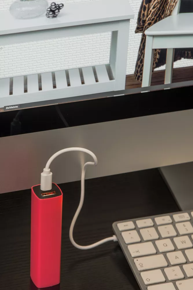 Plastikowy power bank to zewnętrzny akumulatorek o mocy 2200 mAh, który pozwoli doładować telefon lub tablet. Do zestawu dołączony jest kabel z wtyczką mikro USB. Całość pakowana jest w tekturowy kartonik z papieru z recyklingu.