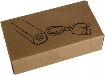 Plastikowy power bank to zewnętrzny akumulatorek o mocy 2200 mAh, który pozwoli doładować telefon lub tablet. Do zestawu dołączony jest kabel z wtyczką mikro USB. Całość pakowana jest w tekturowy kartonik z papieru z recyklingu.