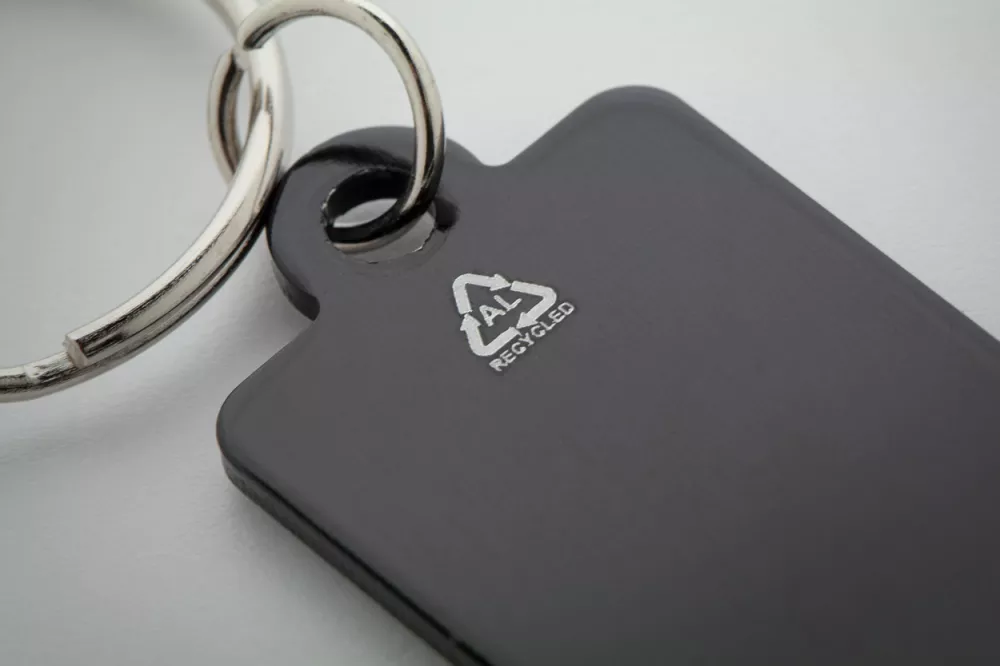 Aluminiowy brelok z recyklingu z żetonem do wózka na zakupy.
