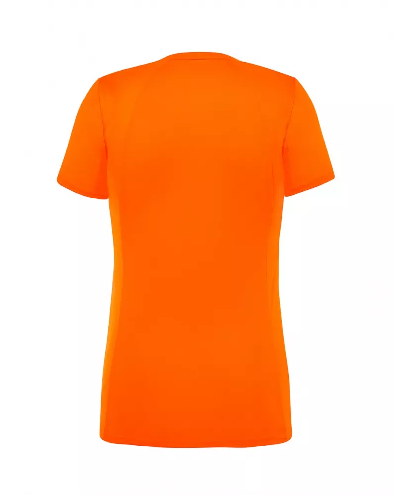 Damski t-shirt sportowy. Dekoracyjne przeszycia z przodu, z tyłu i na rękawach. Krój dopasowany do sylwetki. Oddychający materiał szybkoschnący. 100% poliester teksturowany.