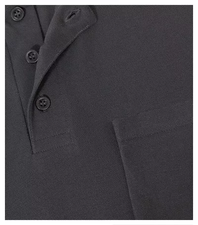 niekurczliwa bawełna odporna na wyższe temperatury, temperatura prania do 95 °C (biały) oraz 60 °C (kolor), krój z rozporkami na końcach bocznych szwów, kołnierzyk oraz lamówka z dzianiny ściągaczowej 1:1, plisy z 3 guzikami w kolorze materiału, wewnętrzna część lamówki wykończona taśmą z tego samego materiału co koszulka, szew na ramionach wzmocniony taśmą, kieszonka pakowana osobna dla jej łatwiejszego znakowania