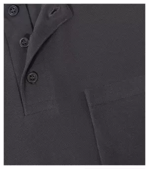 niekurczliwa bawełna odporna na wyższe temperatury, temperatura prania do 95 °C (biały) oraz 60 °C (kolor), krój z rozporkami na końcach bocznych szwów, kołnierzyk oraz lamówka z dzianiny ściągaczowej 1:1, plisy z 3 guzikami w kolorze materiału, wewnętrzna część lamówki wykończona taśmą z tego samego materiału co koszulka, szew na ramionach wzmocniony taśmą, kieszonka pakowana osobna dla jej łatwiejszego znakowania