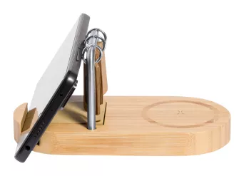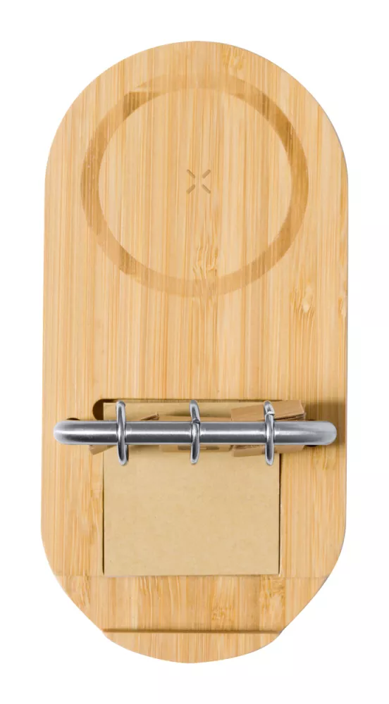 Bambusowa, wielofunkcyjna, szybka ładowarka indukcyjna (15W) z uchwytem na telefon i wiecznym kalendarzem na metalowej ramie. Z portami ładowarki USB i USB-C. Zawiera 50 arkuszy samoprzylepnych karteczek z papieru kraft i kabel do ładowarki USB.