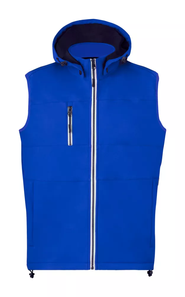 Wiatro i wodoodporna, zapinana na zamek kamizelka typu softshell z 2 kieszeniami bocznymi, 1 kieszenią przednią, kołnierzem ze stójką i odpinanym kapturem. 100% poliester, 300 g/m².