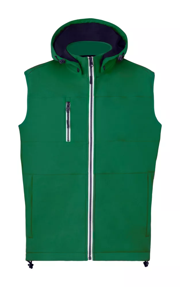 Wiatro i wodoodporna, zapinana na zamek kamizelka typu softshell z 2 kieszeniami bocznymi, 1 kieszenią przednią, kołnierzem ze stójką i odpinanym kapturem. 100% poliester, 300 g/m².