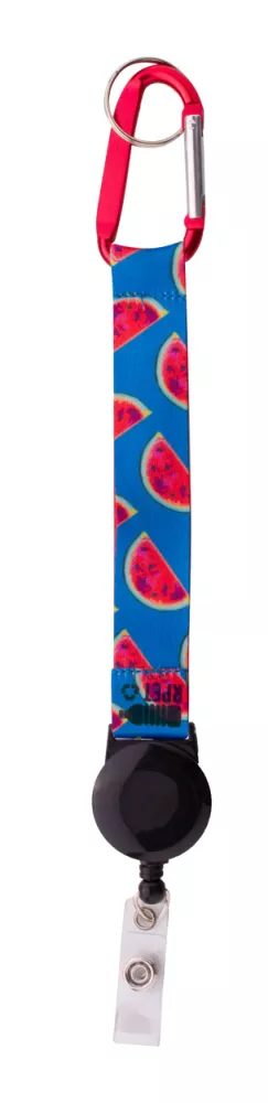 Personalizowany brelok poliestrowy RPET z nadrukowaną grafiką sublimacyjną po obu stronach. Z teleskopowym uchwytem na kartę/ski pass, aluminiowym karabińczykiem i metalowym kółkiem na klucze. Z metką RPET. Min. ilość: 100 szt.