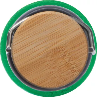 Szklana butelka o pojemności 600 ml, z pokrywką ze stali nierdzewnej i bambusowym zamknięciem. Butelkę przed uszkodzeniami chroni neopropanowe etui.