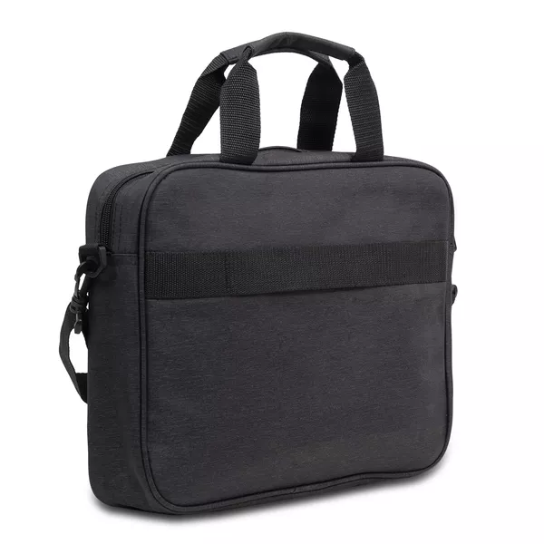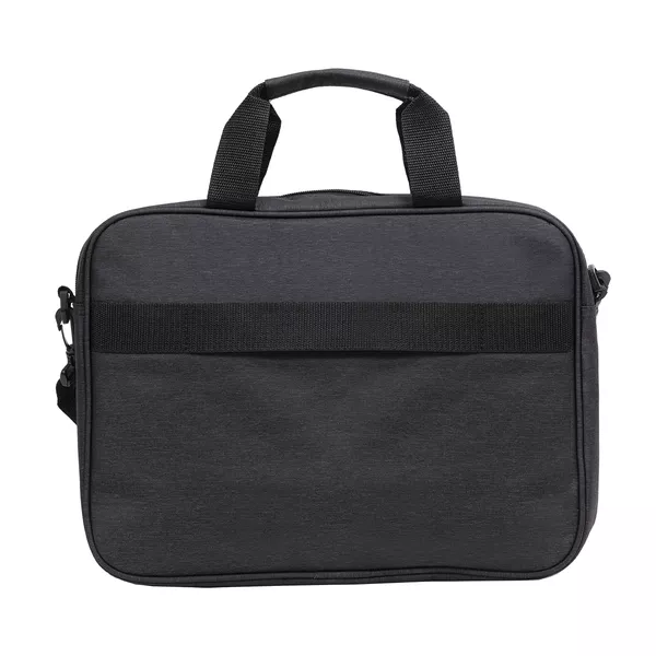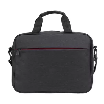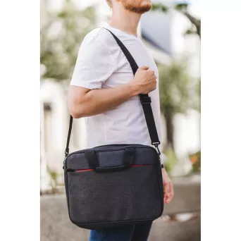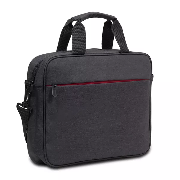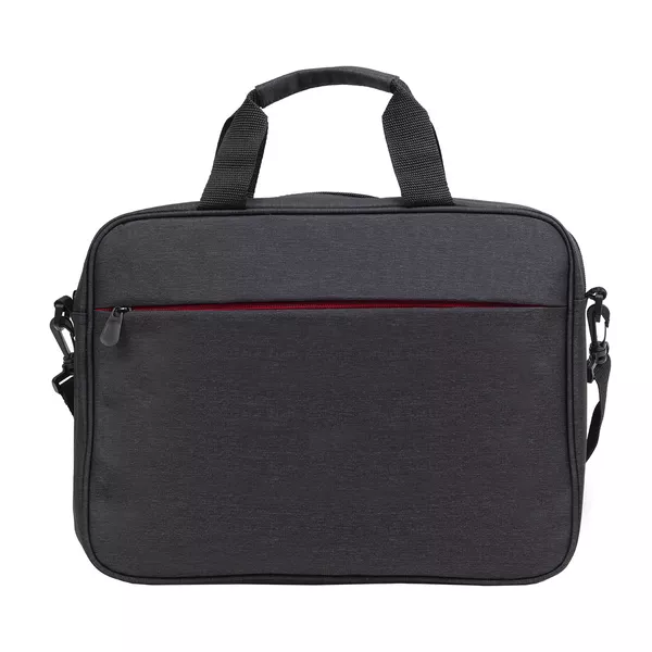 Torba na laptop z ciemnej melanżowej tkaniny. Główna przegroda przeznaczona na laptop 15". Dodatkowa kieszeń zewnętrzna zapiana na kontrastowy, czerwony zamek. Miękkie wnętrze, wyściełane podszewką 210T. Regulowany, dopinany pasek pozwala nosić torbę na ramieniu. Dodatkowy pasek z tyłu torby pozwala umieścić ją na rączce od walizki.