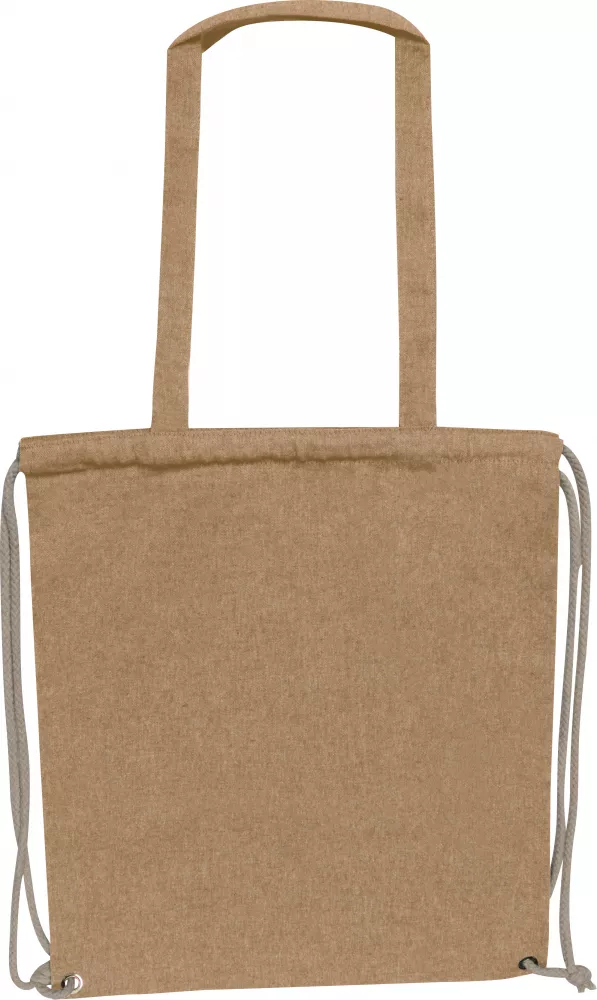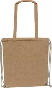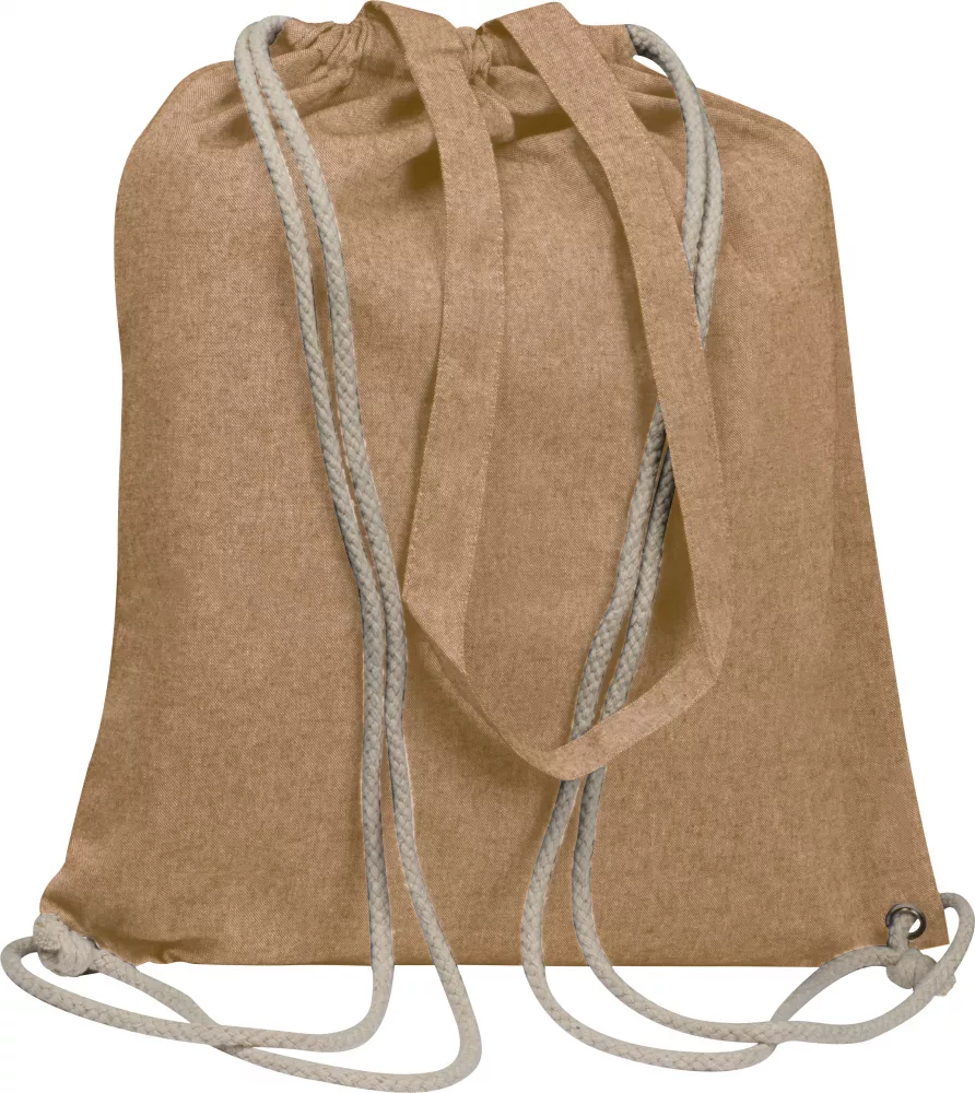 Bawełniana torba-worek z bawełny pochodzącej z recyklingu, z certyfikatem Oeko-Tex® STANDARD 100, o gramaturze 140g/m². Torba posiada długie uchwyty do noszenia na ramieniu i sznurki do zamykania i noszenia na plecach.